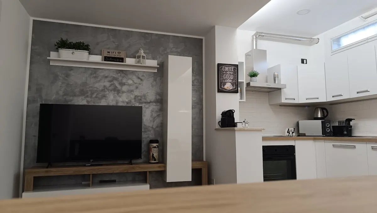 Let yourself be won over by this cozy apartment with contemporary design, where comfort and style offer you an unforgettable stay. The bright living area, with a flat-screen TV and refined details, is the ideal place to unwind after a day of excursions or cultural visits, or after an intense day of work.