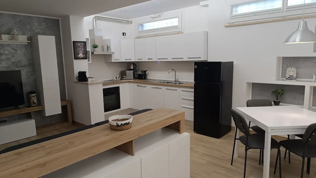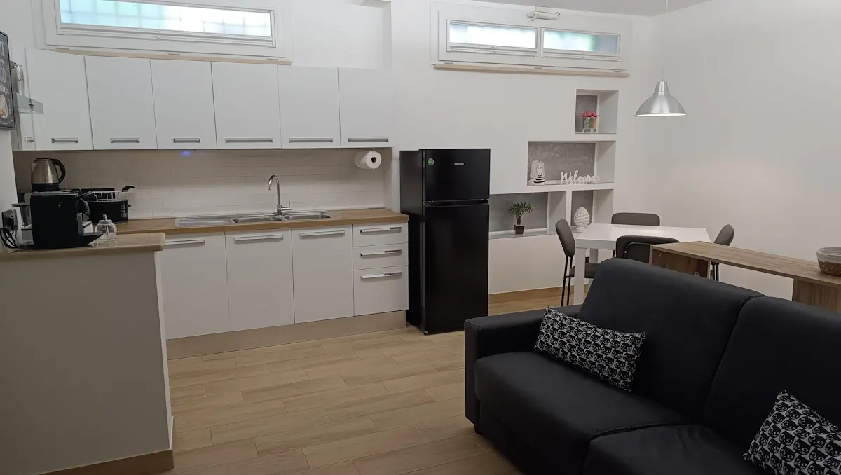 The bright dining table, ideal for convivial moments, makes the space welcoming and functional. A perfect corner for those who love to feel at home even on vacation, with the freedom to cook and enjoy dishes in an elegant and comfortable environment.